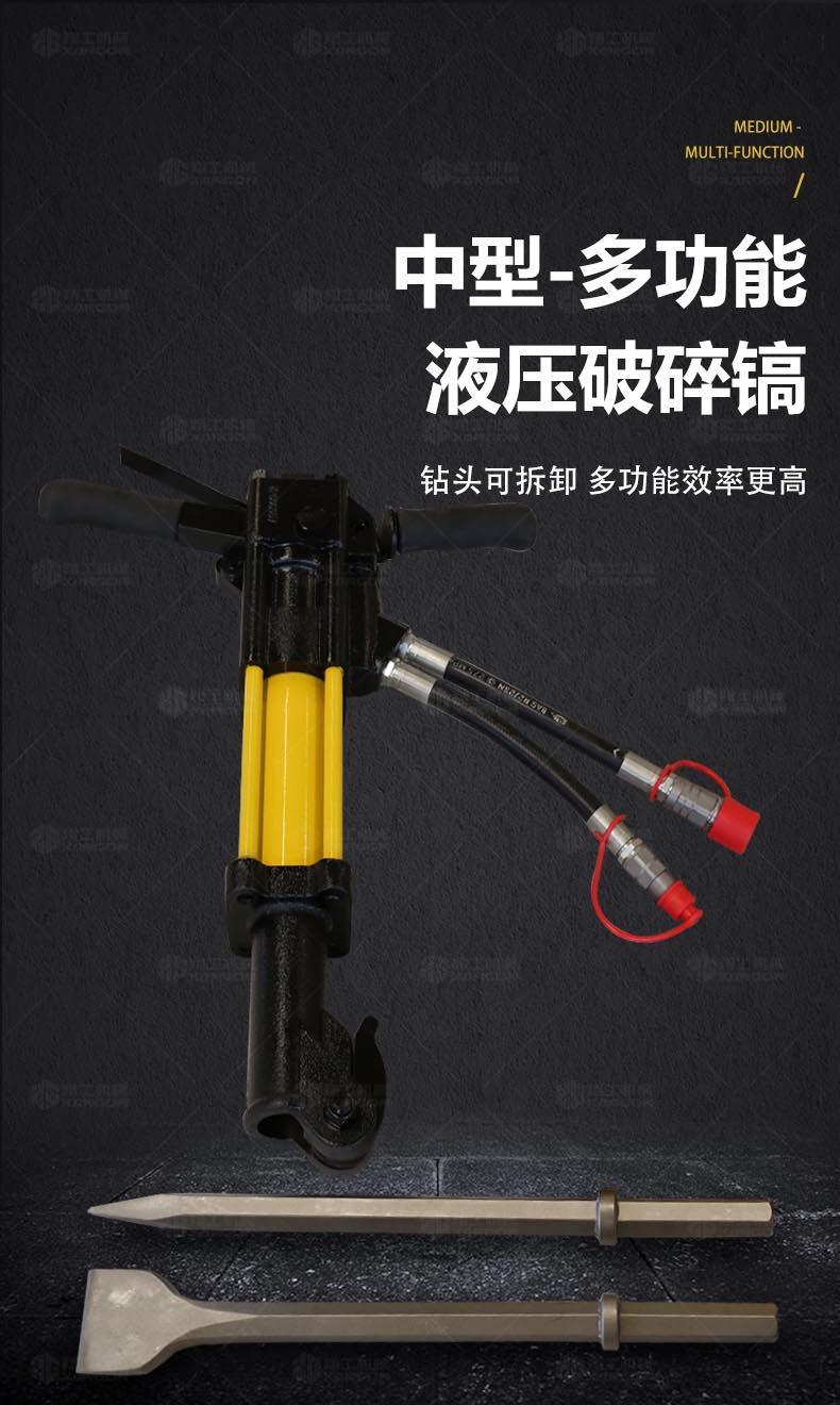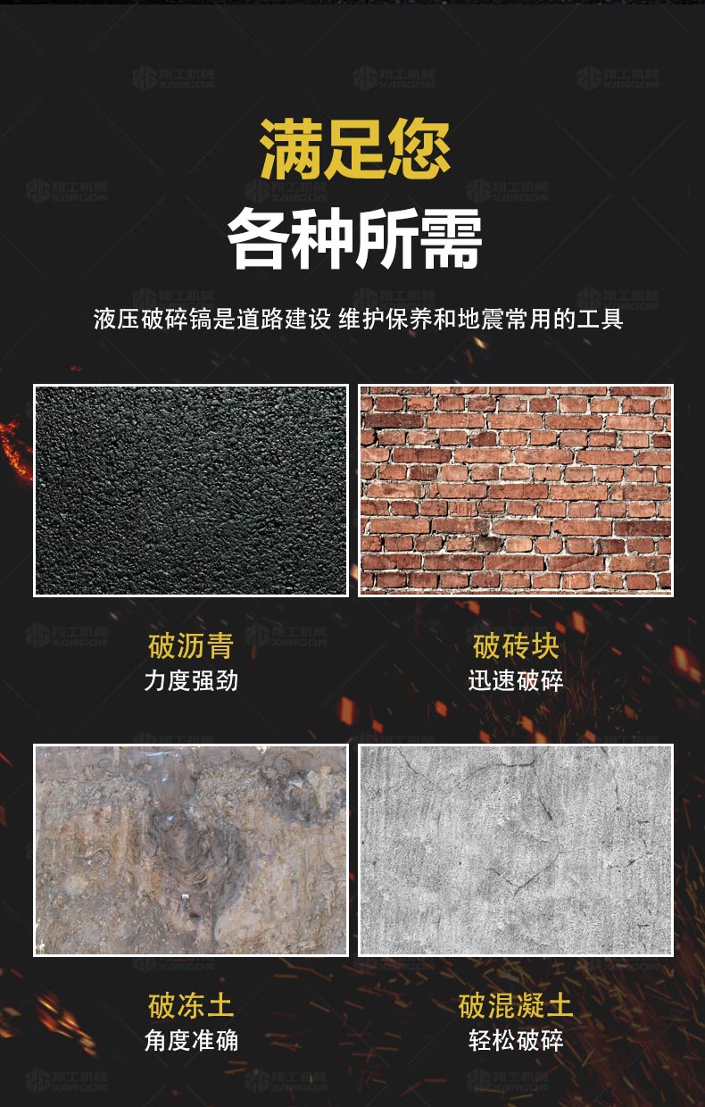 液压破碎镐是一种破碎工作,可以用沥青、水泥路面、钢筋混凝土等破碎施工,也可以用于大体积石料的破碎解体,不同规格液压破碎镐功能能力不同,山东翔工机械有限公司供应各种规格液压破碎镐,产品详情如下:...